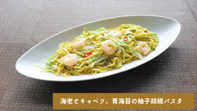 ・パスタ:海老とキャベツ、青海苔の柚子胡椒パスタ