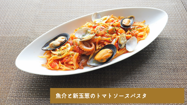 ・パスタ:魚介と新玉葱のトマトソースパスタ