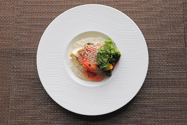 ・白身魚のポワレと有頭海老 ヴァンブランソース
